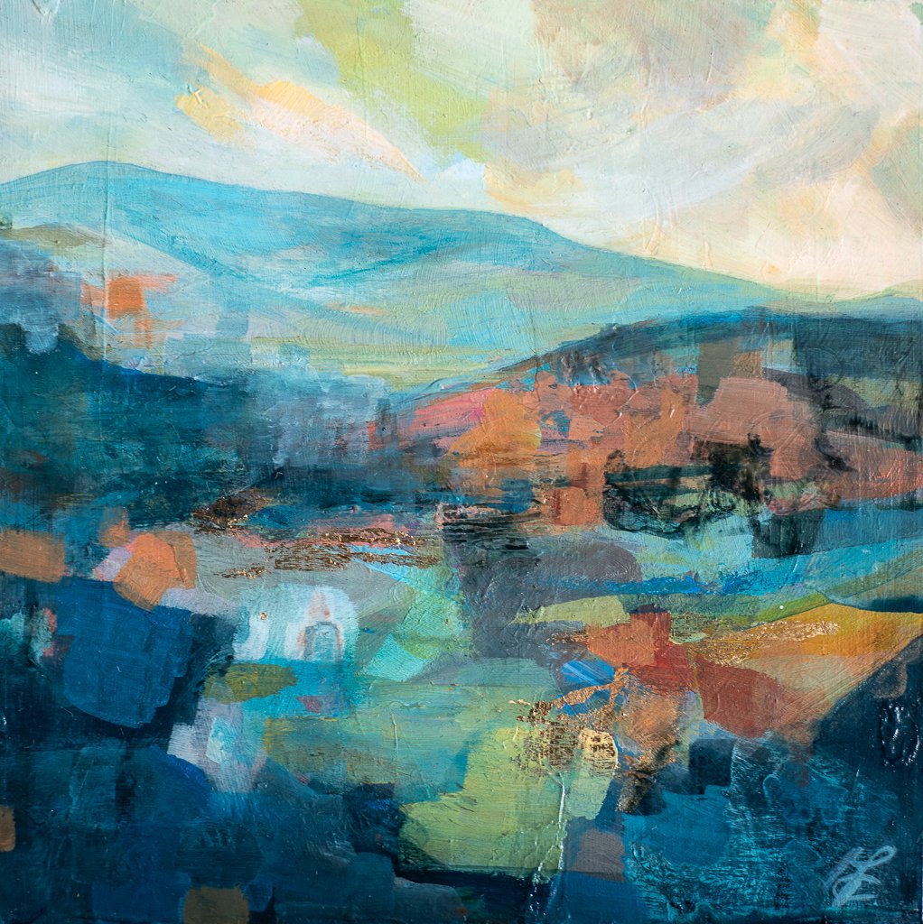 Original, mixed media painting, 12" x 12" (acrylic and gold leaf) on 3mm birch ply. Framed in a mid-grey box frame. (5mm visible edge x 22mm deep).